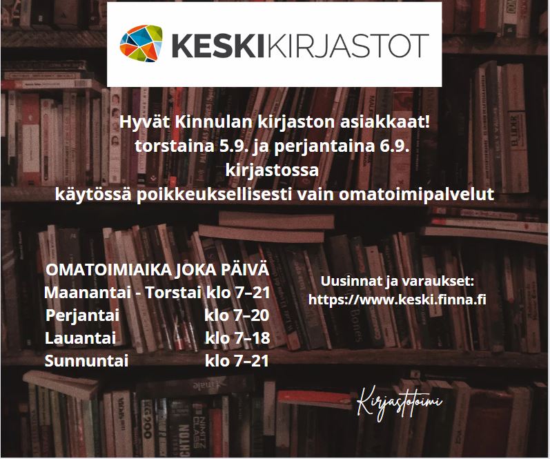 Kirjastossa vain omatoimipalvelu käytössä 5.9. ja 6.9.