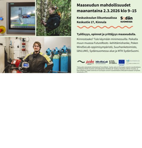 Julkaistu 19.02.2026 Maaseudun mahdollisuudet minimessut Maaseudun mahdollisuudet minimessut 2.3.2026 klo 09:00-15:00 Keskuskoulun liikuntasalissa, tervetuloa!