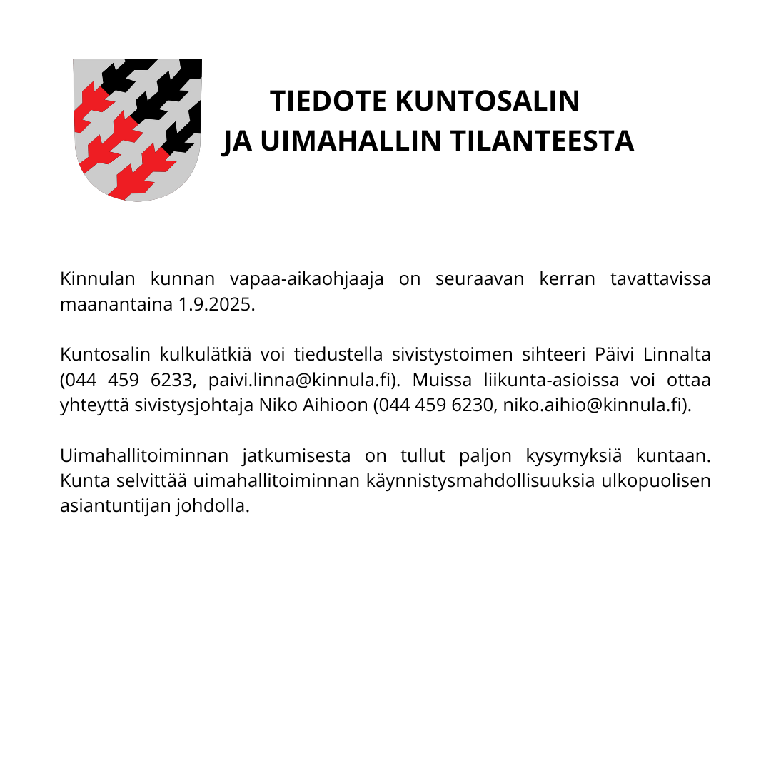 Tiedote kuntosalin ja uimahallin tilanteesta