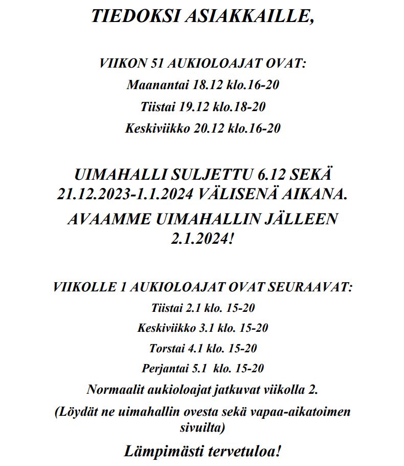 Uimahallin loppuvuoden ja vuodenvaihteen aukioloajat
