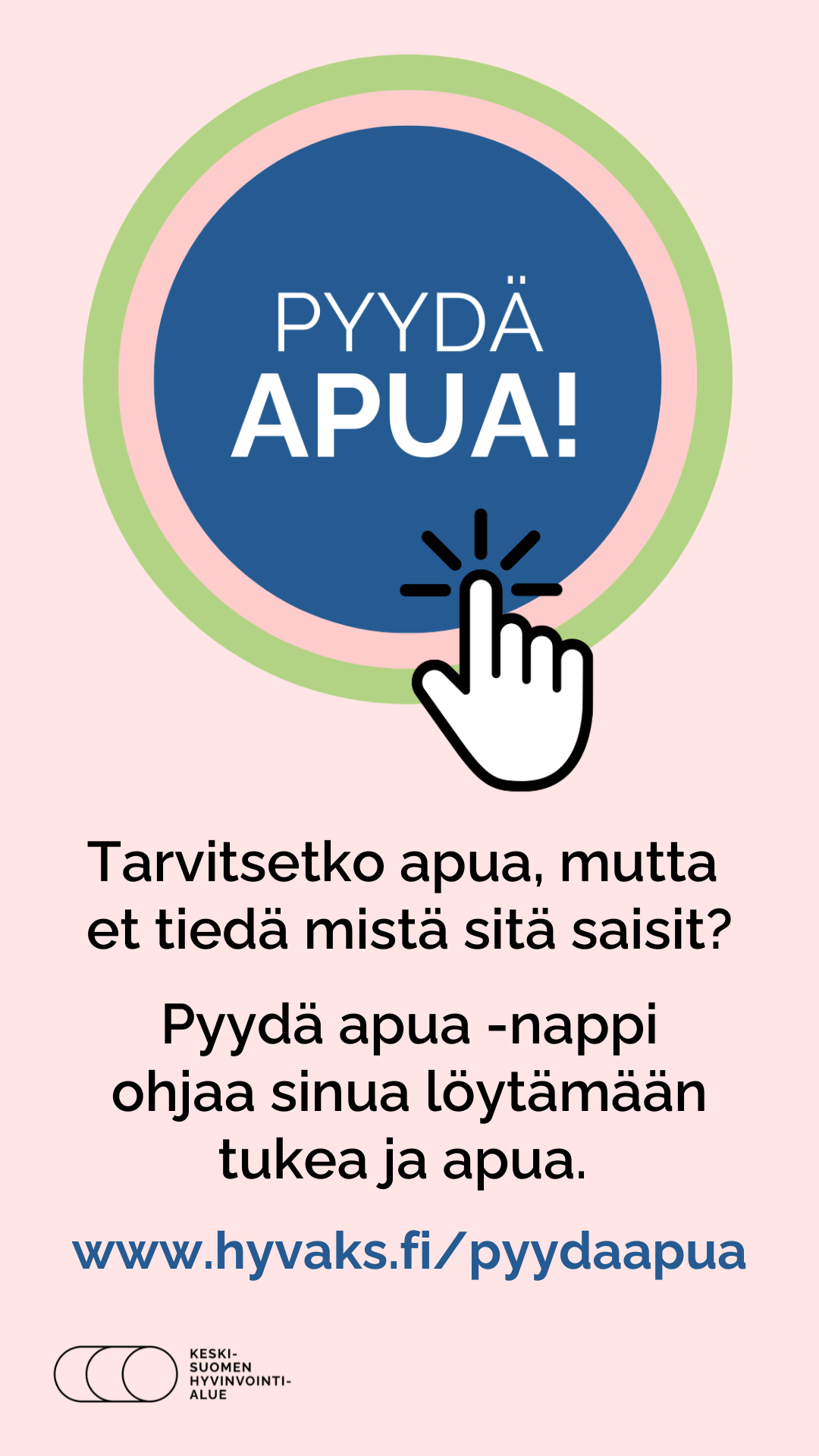 Pyydä apua -nappi on Keski-Suomen hyvinvointialueen tarjoama matalan kynnyksen digitaalinen yhteydenottokanava, jonka kautta saat ohjausta ja neuvontaa oikeanlaisen avun piiriin. Apua voit pyytää myös nimettömänä tai nimimerkillä. Apua pyytäessäsi sinun ei tarvitse tietää, mihin palveluun tai kehen ammattilaiseen tulee olla yhteydessä.