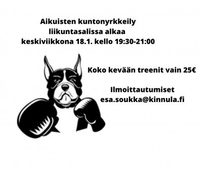 26.04.2023 19:30 - 26.04.2023 21:00 Aikuisten kuntonyrkkeily liikuntasalissa 18.1. alkaen Ilmoittautumiset Esalle.