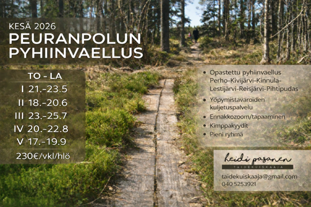 Lähde löytöretkelle itseesi ja Peuranpolun jylhiin maisemiin! Peuranpolun pyhiinvaellus kesällä 2026 on viiden etapin ja yhteensä 100 km:n matka kohti olennaista – voit osallistua koko vaellukselle tai valita sinulle sopivimman etapin. Tarjoamme yöpymistarvikkeiden kuljetuspalvelun, jotta sinä voit keskittyä askeleen keveyteen ja luonnon voimaan. Ota yhteyttä Opas-Heidiin (040 5253921) ja varaa paikkasi tästä ainutlaatuisesta kokemuksesta!