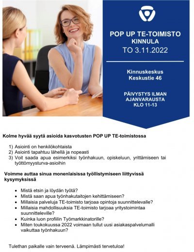 Pop up TE-toimisto Kinnuskeskuksessa 3.11.2022 klo 11-13